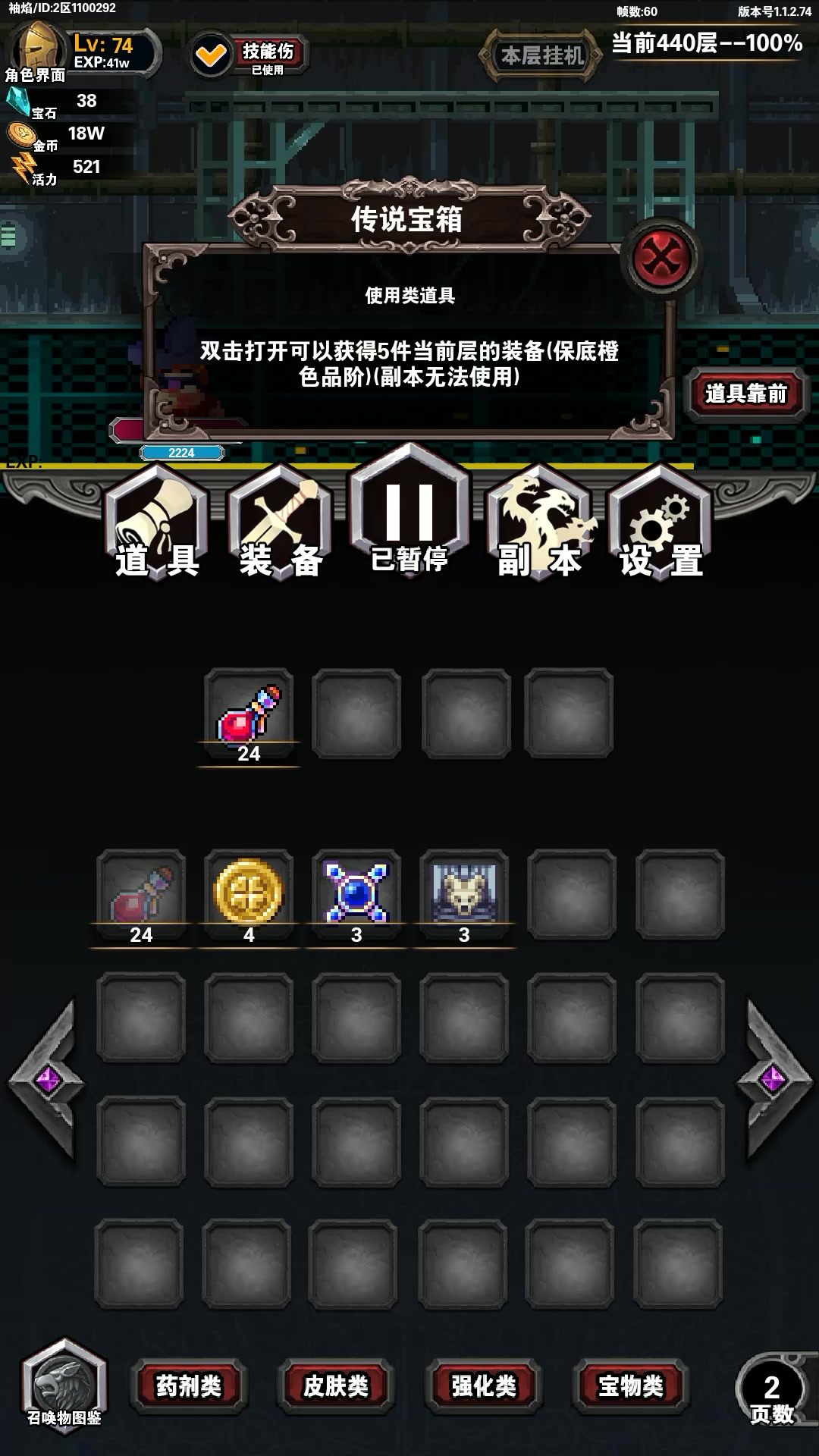 第十四天:等级72 层数420 继续挂 水晶套 宝石古币越来越多了。。 好装备太难出。