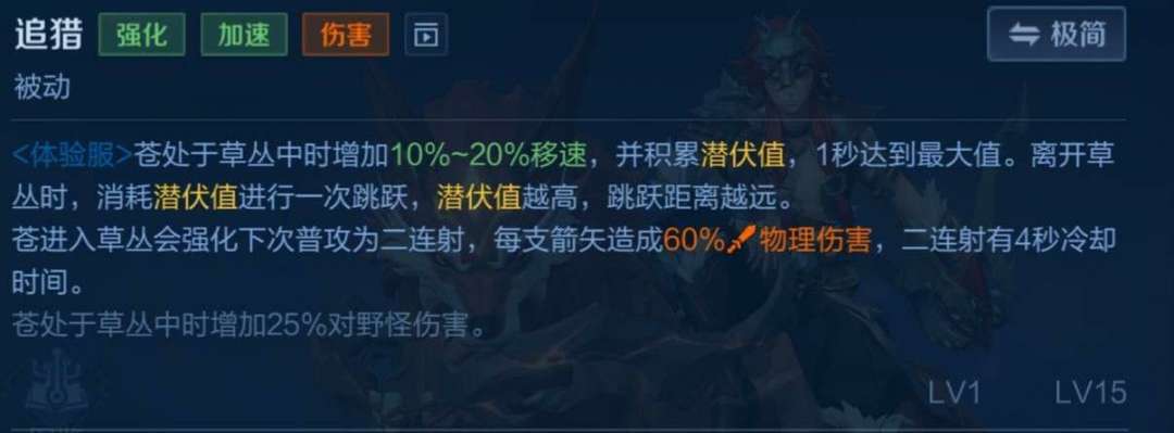 4.被动:在草里可增加移动速度,那个潜伏值就是在草里蓄力的能量条,1秒满格,潜伏值越高,距离就越远。
