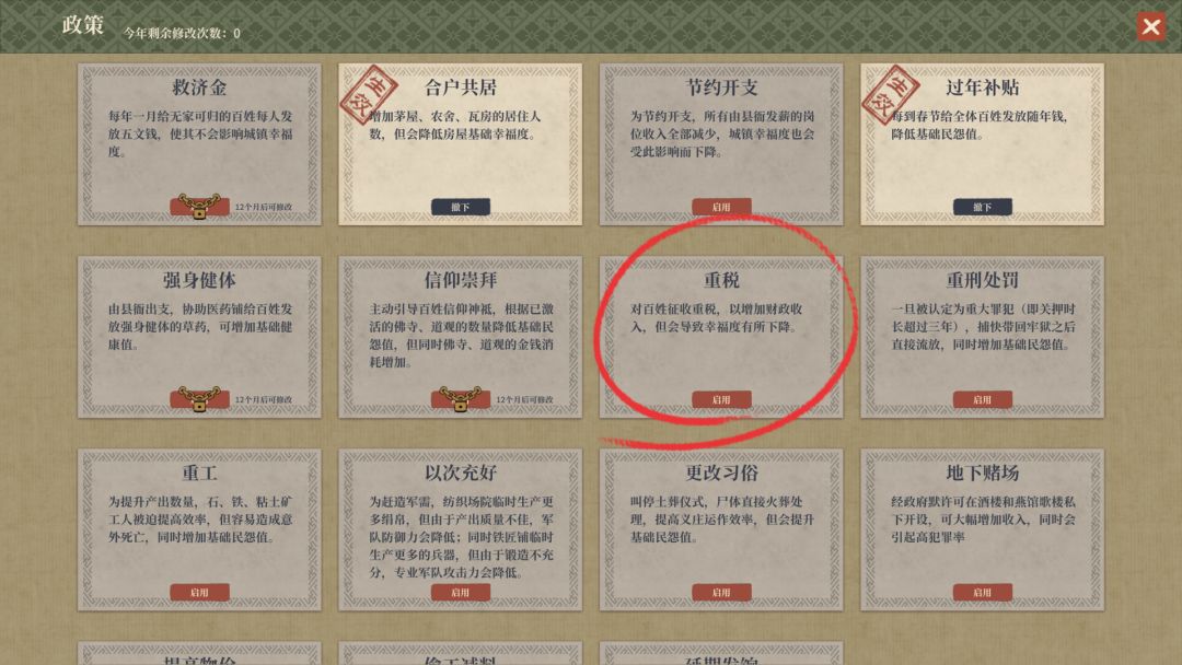 到这还剩最后一步,在右下角政策里,选择启用重税才能在赋税里选中哦。