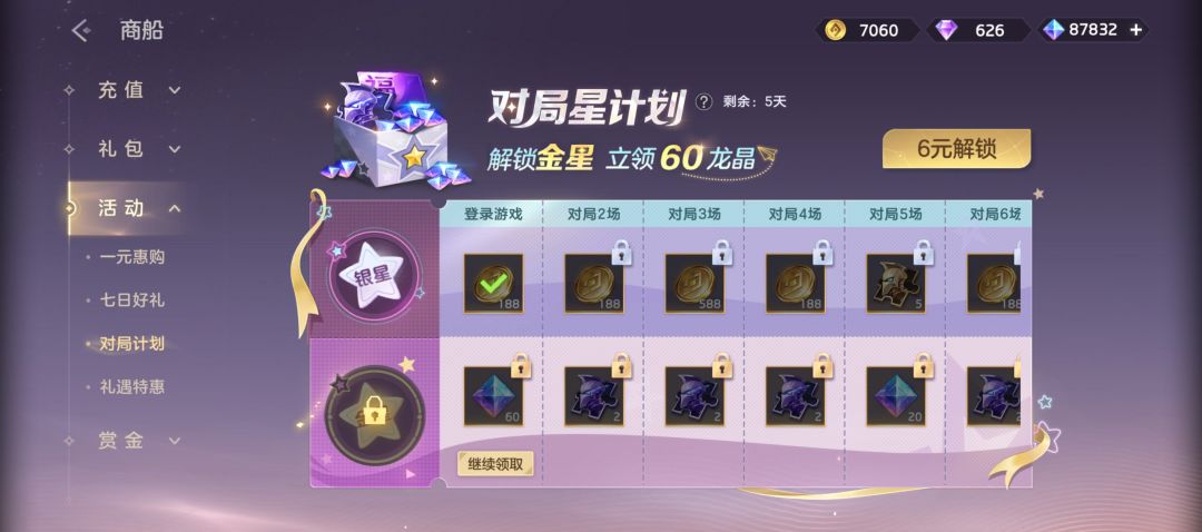 完成对局任务,提升等级免费获取英雄碎片、金币,付费6元解锁金星可以获得龙晶*120、龙魂祈福卡、皮肤碎片。