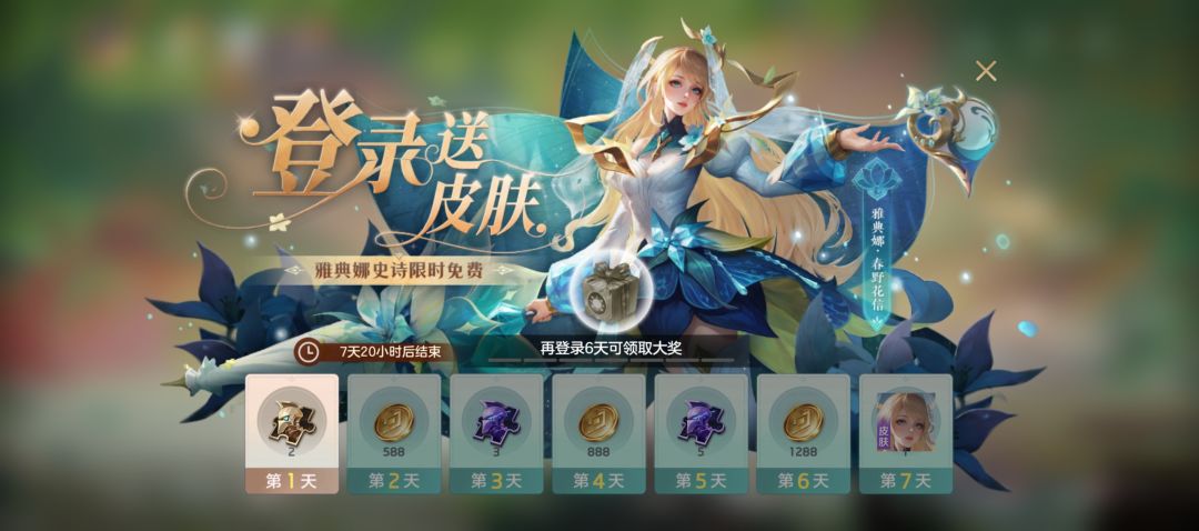 每日登录游戏领取英雄碎片、皮肤碎片、金币等奖励,累计登录7天即可领取雅典娜史诗皮肤【春野花信】、播报自选箱。