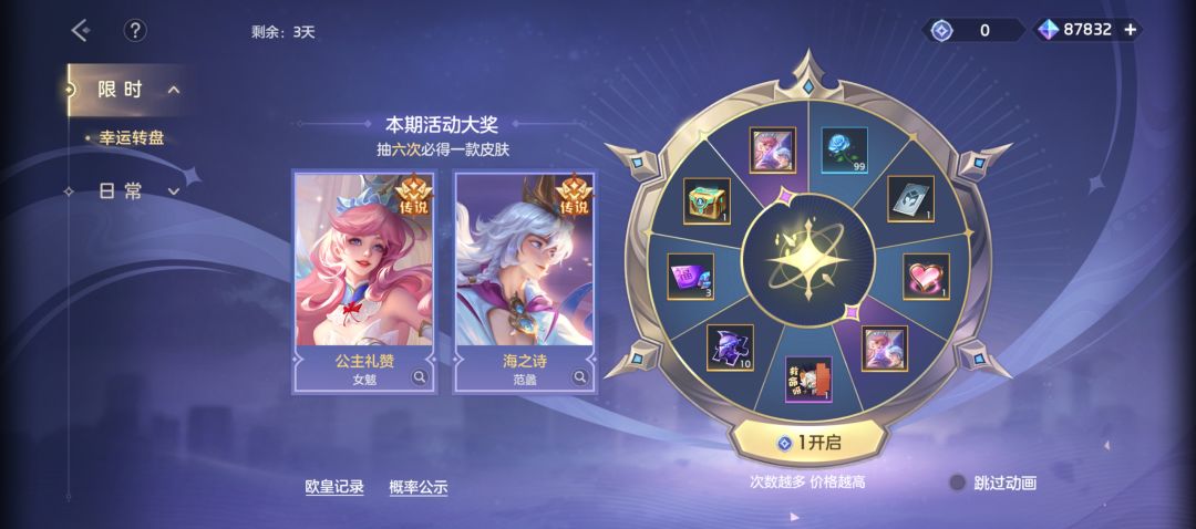 使用龙晶购买获得幸运币进行抽奖。女魃·公主礼赞、范蠡·海之诗、回城特效自选箱、龙魂祈福卡、皮肤碎片、救命呀表情、改名卡、好感度礼包等奖励等你来抽!最多6抽获得一款皮肤,最多9抽可获得全部奖励,前2抽抽到皮肤的守护者会获得欧皇称号。