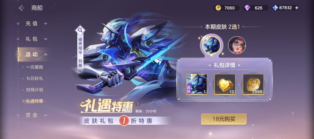 礼遇皮肤礼包限时1折,刘备·破界指令、黄月英鸱吻镇脊超值2选1!