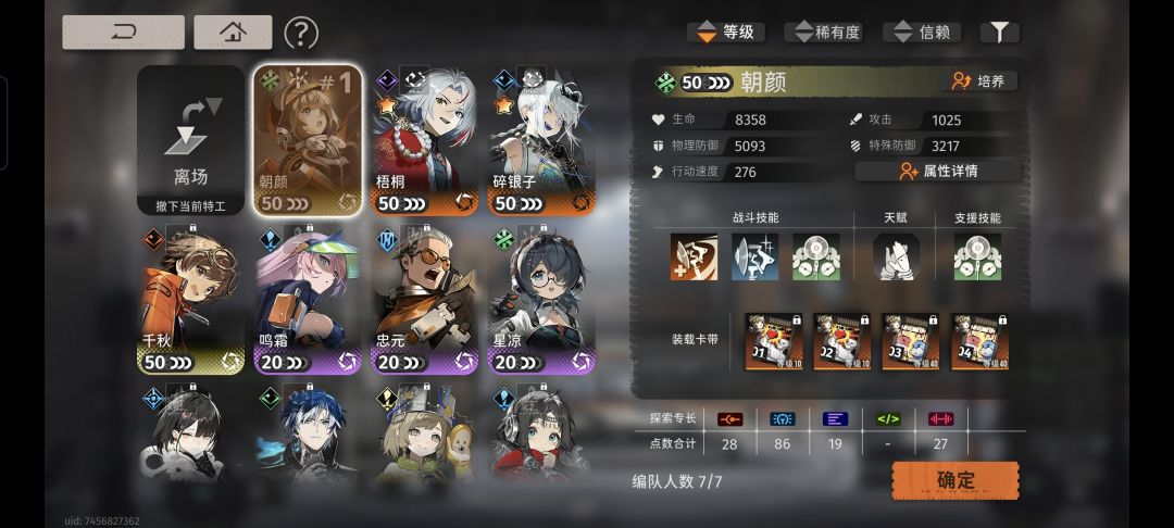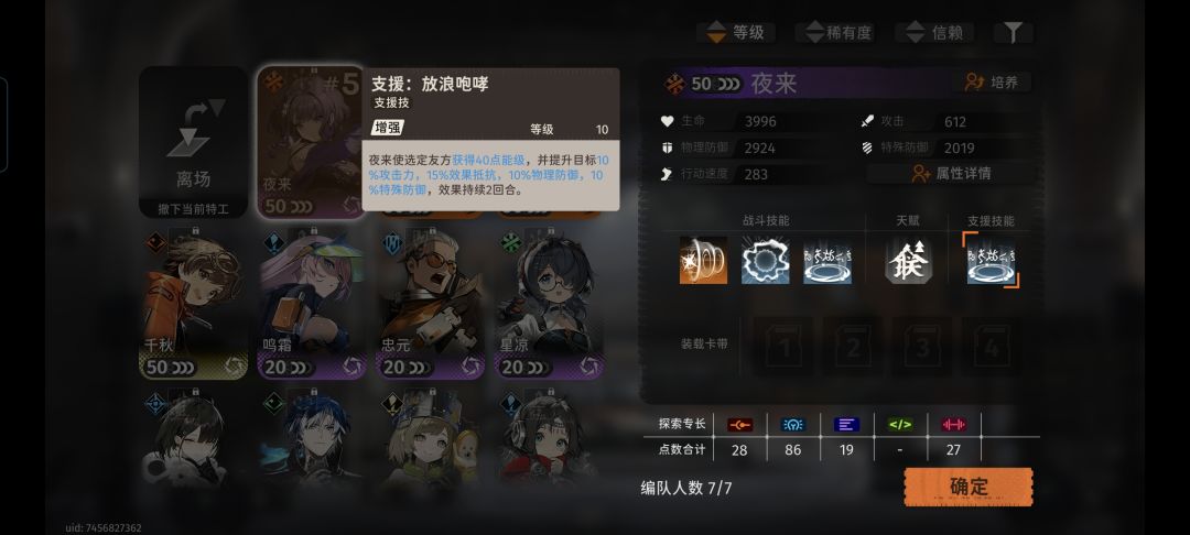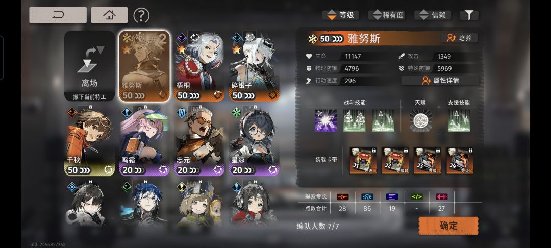 卡带如图,只有雨人雅努斯卡带等级满的,剩下捡破烂,毕竟刚玩资源真的缺。夜来10级支援(少点也没事,后面塔层buff给很多能级,也不缺)