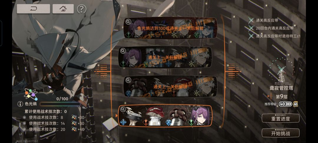 第10层直接在10-1叠层,一样是银峰超限,其余战术雨人超限给1、4号位任一,一次3层超限1、4号位枪手就下线了,留2、3位矮个子枪手叠buff,叠满收菜去10-4,有buff这个也就是雨人两次超限结束了。