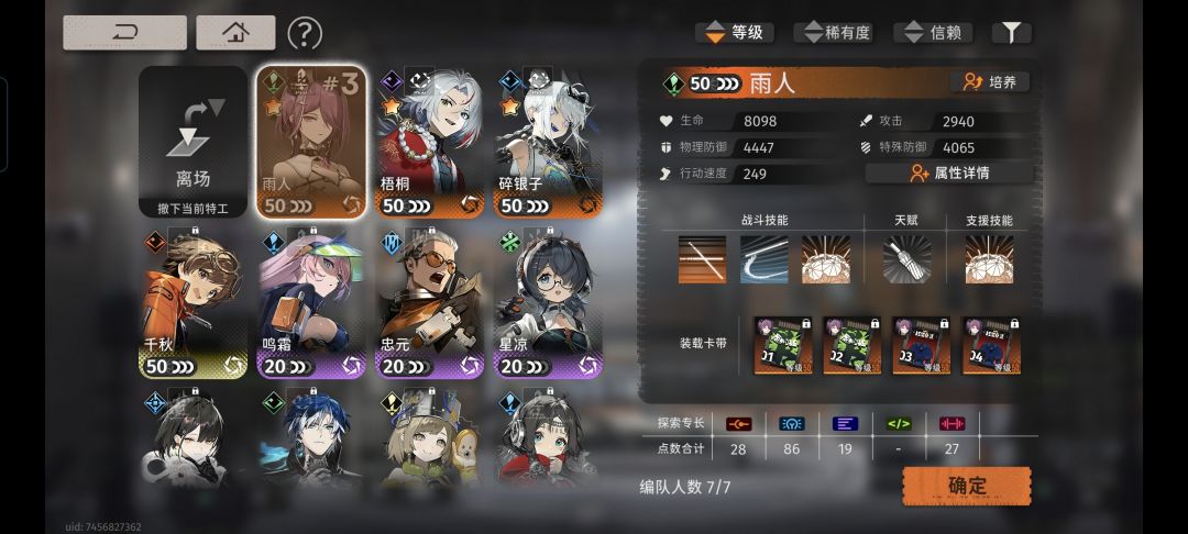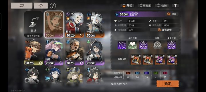 前7层感觉生存压力不大就上绿雪,一直战术给雨人,雨人进场战术,第二回合超限清一波,然后看塔层buff条件耗着存满,打满100增益很高。