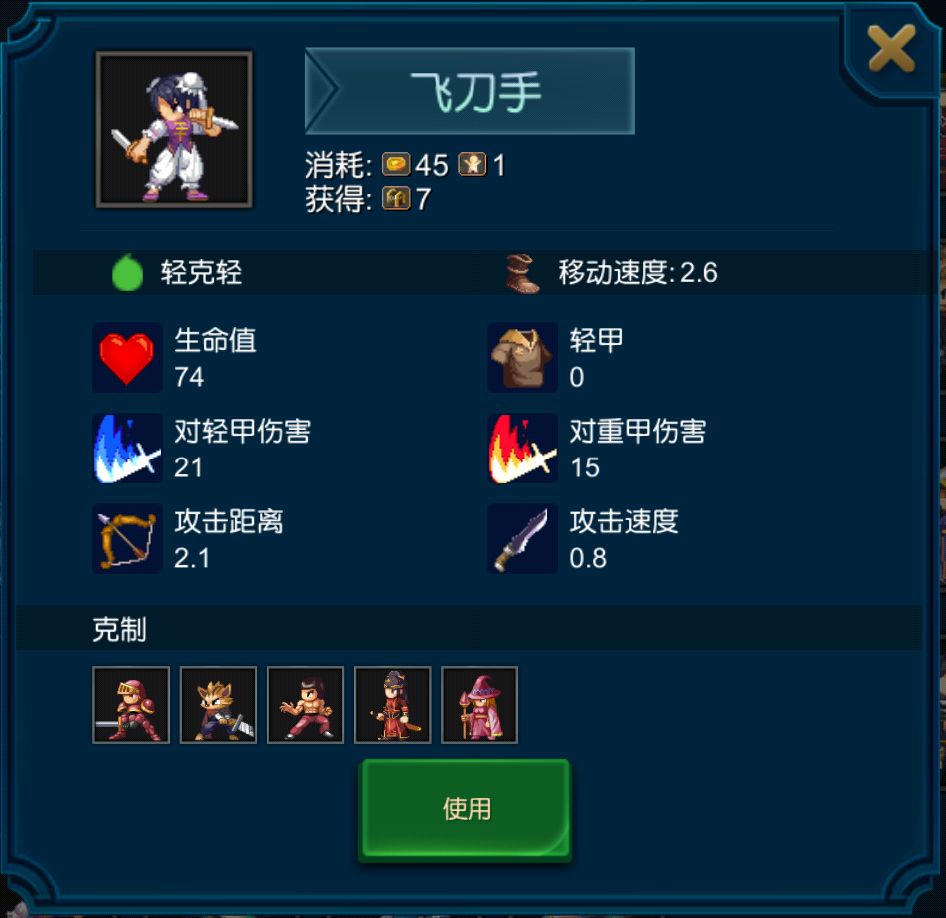 2.移速稍微有点点慢,2.6移速对于需要组成阵法后出的轻甲兵种来说就有点慢了,当然飞刀手是远程兵种,本来也不会靠近对手再停下,只会站在后面就开打,所以这个问题不是很明显,即使是后期配合骑兵也可以出,站在最后依旧能打输出。