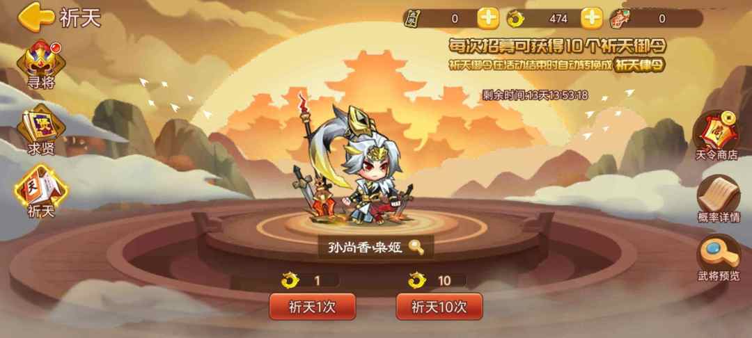活动内容:活动期间累积祈天达到次数,即可领取神将碎片奖励。