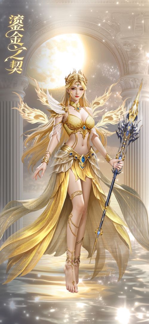 “这套『鎏金之契』幻装,男装采用金色甲胄设计,线条硬朗流畅,纹路精美复杂,彰显出力量与威严。甲胄边缘泛着流动的金光,仿佛蕴含着无尽的能量,金色飘带则增添了几分飘逸之感。女装则更为柔美华丽,金色胸衣搭配同色系的裙装,裙摆轻盈灵动,走动间似有星光洒落。背后的羽翼装饰梦幻而神圣,与男装的霸气相互映衬,整体造型将高贵与梦幻完美融合……”