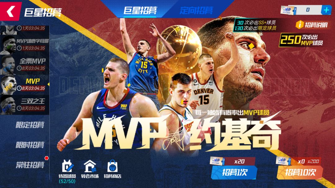 MVP卡池全员首次十连免费!至多抽取250次,成功将MVP掘金约基奇签约入队!130抽必出SS+限定球员,每30抽必出大师球员!