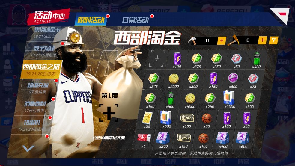 锁定需要的大奖,拿起铁锹开始淘金探险!每挖开一个区域,都可以获取到奖励,挖到锁定大奖,即可进入新一层的淘金探险。一起去西部淘金吧,[大师50选1]、[突破指导]、[顶级专精指导]、[球星招募函]、[体育馆升级材料]等珍稀“金矿”,在通往西部的路上等你发现!