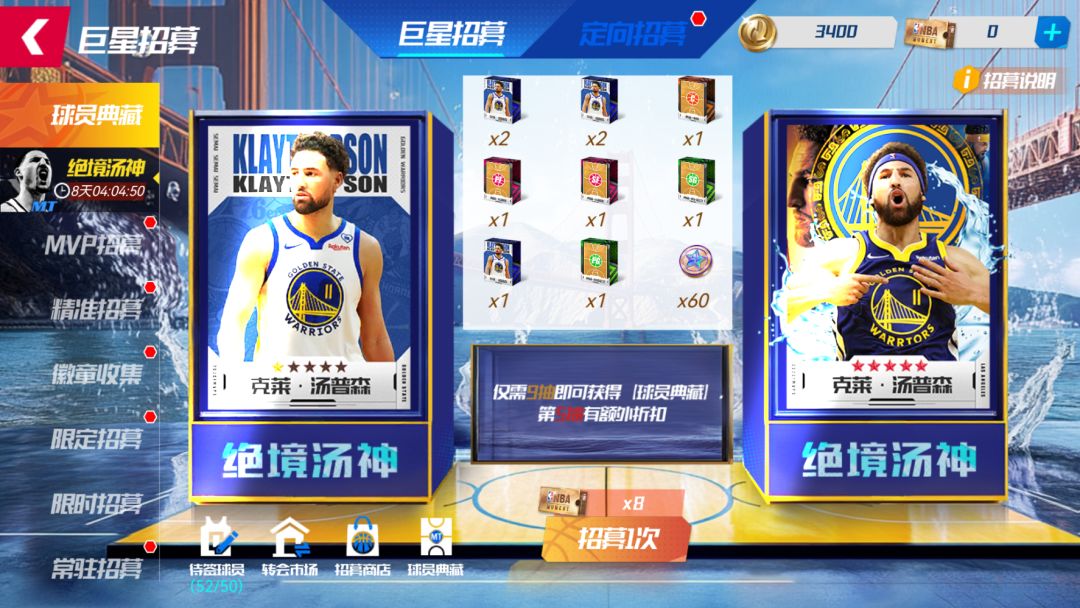 每次“抽一次”,则随机解锁一个奖励格,获取奖励格中的“球员典藏”或“典藏硬币”或“通用位置典藏”。至多抽取9次,成功将勇士队汤普森球员典藏收入囊中!