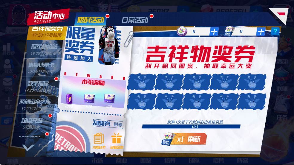 听说魔术队的吉祥物推出了一批超高中奖率限量奖券,刮开两个相同图案即可获得限量奖励,快来试试手气,刮出大奖吧!每张奖券共10个刮奖区,经理人可以消耗刮奖硬币来刮开奖券,刮奖区中出现两个相同奖励图案时,可获得该奖励!