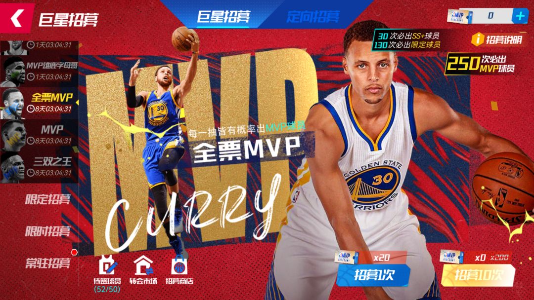 MVP卡池全员首次十连免费!至多抽取250次,成功将MVP勇士库里签约入队!130抽必出SS+限定球员,每30抽必出大师球员!