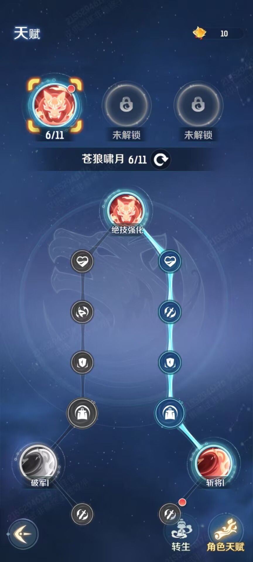 破军天赋下,进场时自带3回合狼月状态;斩将天赋下,狼月状态下击倒目标额外延长1回合狼月状态。
