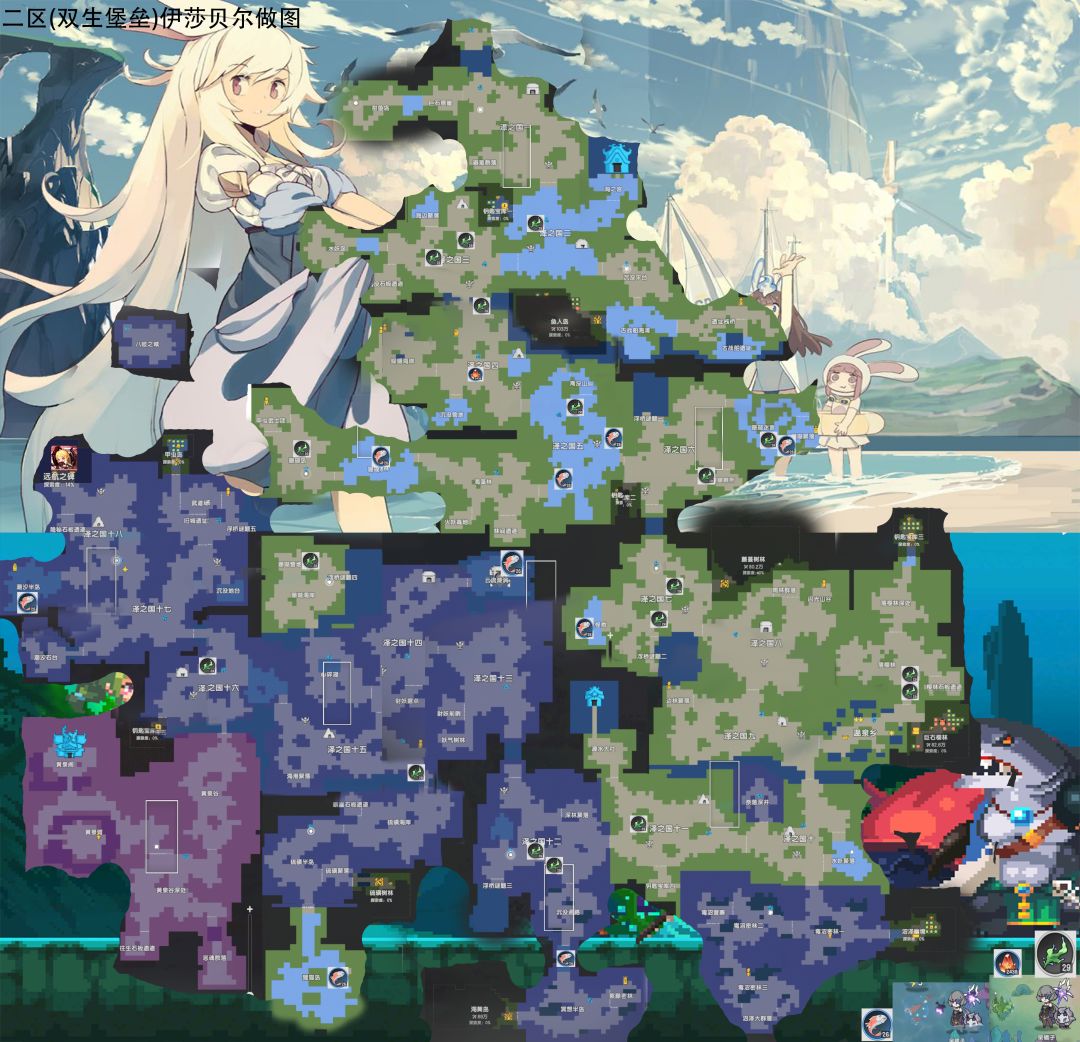 2-海之宫(142,200)、古战船海滩(150,167)、古战船遗址(178,161);3-海边聚落(100,191)、水妖岛(92,185);5-传送门、淹没山脚-左(130,151);6-珊瑚迷宫(175,143);7-水生怪群(141,95);10-水妖聚落(199,44);16-传送门、右侧水域(62,80);沉没地台;云流漩涡;狸猫岛(77,30);