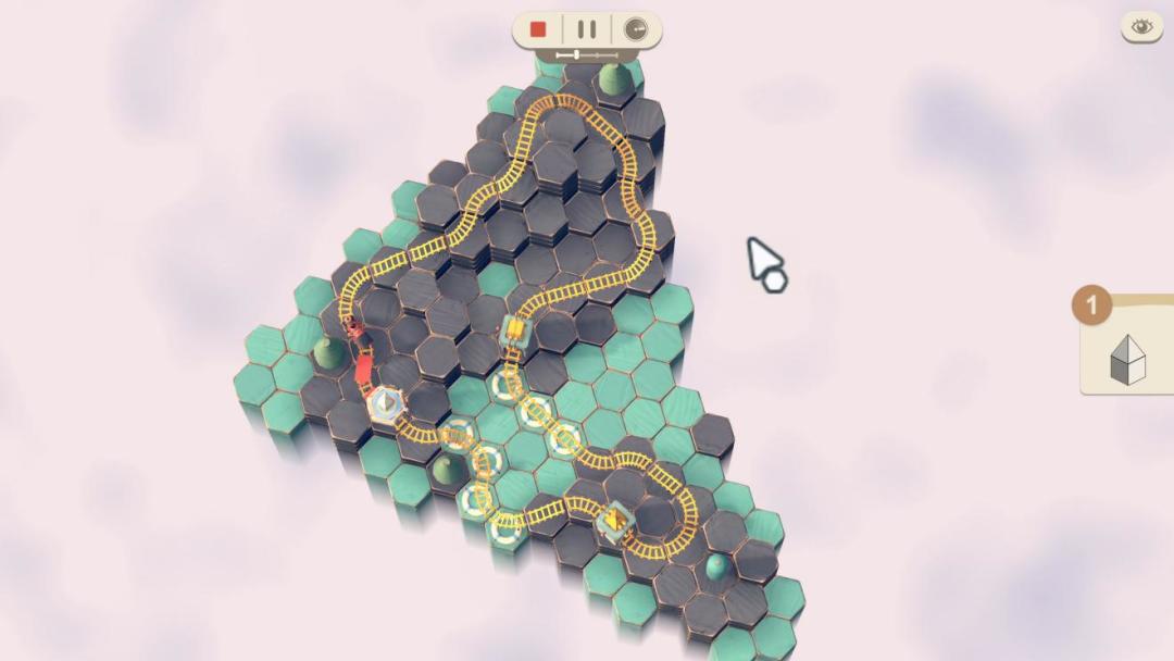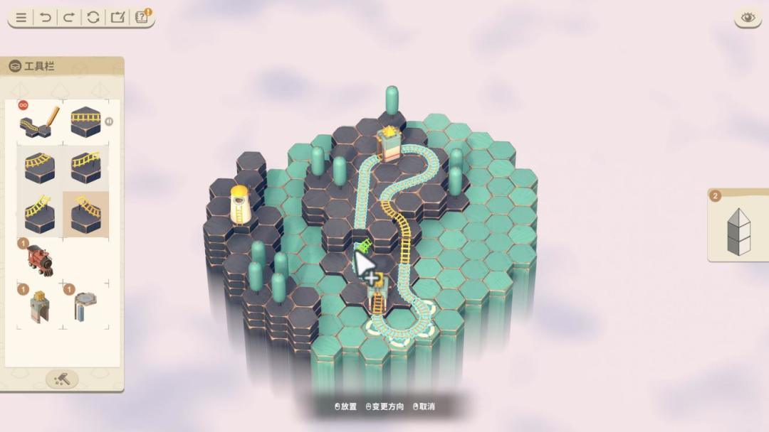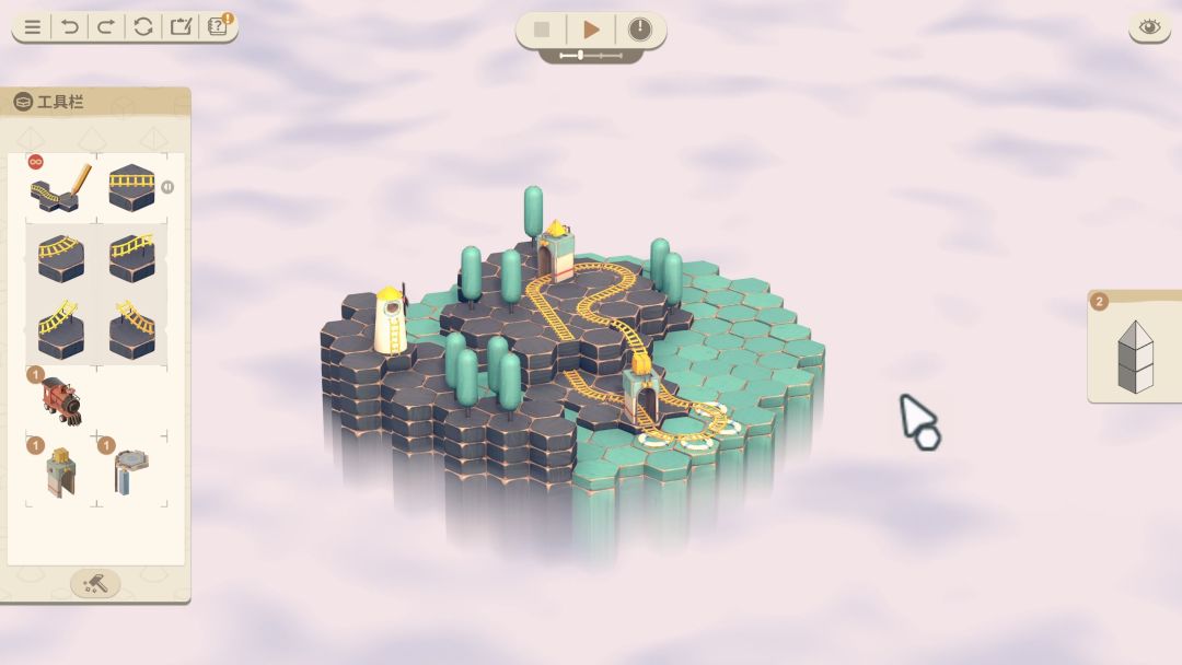 看着挺简单但实际上游戏的难度还是有的,首先就是地形,虽然有爬坡和螺旋两种带有一层高度的轨道,但有些地形起始的高度就是两层,所以还需要不断的调整视角仔细观察,有的时候需要反复绕路搭建螺旋或者爬坡才能完成要求。