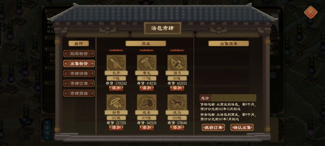 市肆的物品交易需要有商路,也就是市场占有率,商品在售卖到市肆时,游戏会自动进行跑商行为,无需玩家手动操作。也因此,当我们需要出售物资时,需要留意市肆的资金储备,只有市肆资金足够,你才能出售相应数额的物资。