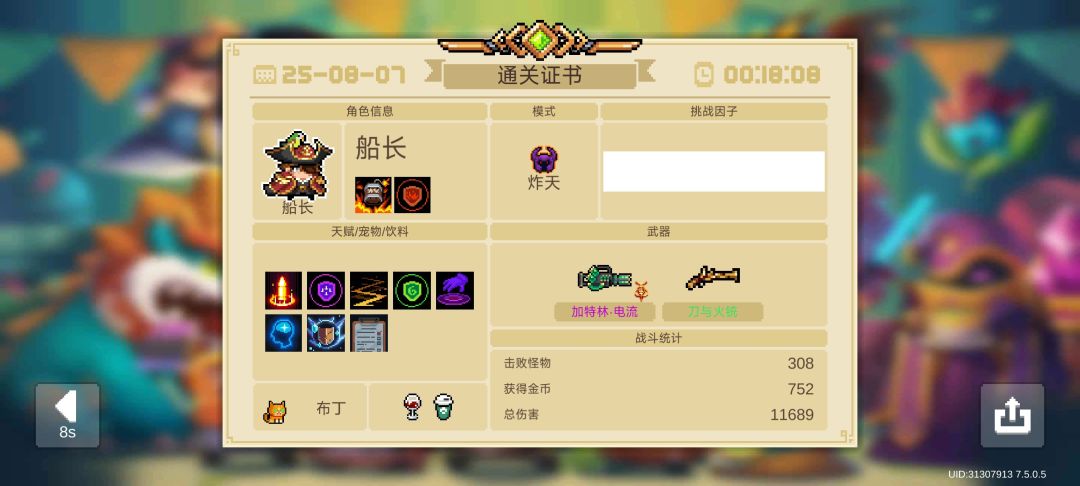 船长手枪,每枪8点伤害,攻速一般,可暴击。