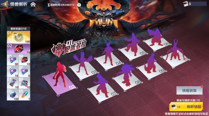 首先是除了一个新活动怪兽解析,完成任务能获得情报,可以解析情报来获得奖励,我大概算了算 手里有三千光晶就能白嫖四次解析,出不出终极大奖就看大家的运气了。至于说想全部抽到手的话,就不是咱们白嫖玩该考虑的了。