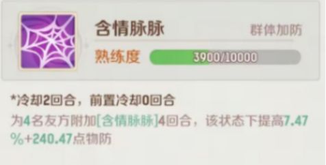 该技能主要就是给我方单位增加物理防御,无前置冷却,使用冷却2回合。从测试来看,该技能对于我方物理防御的加成很高。(曼舞天赋可以使该技能额外增加控制抵抗。)