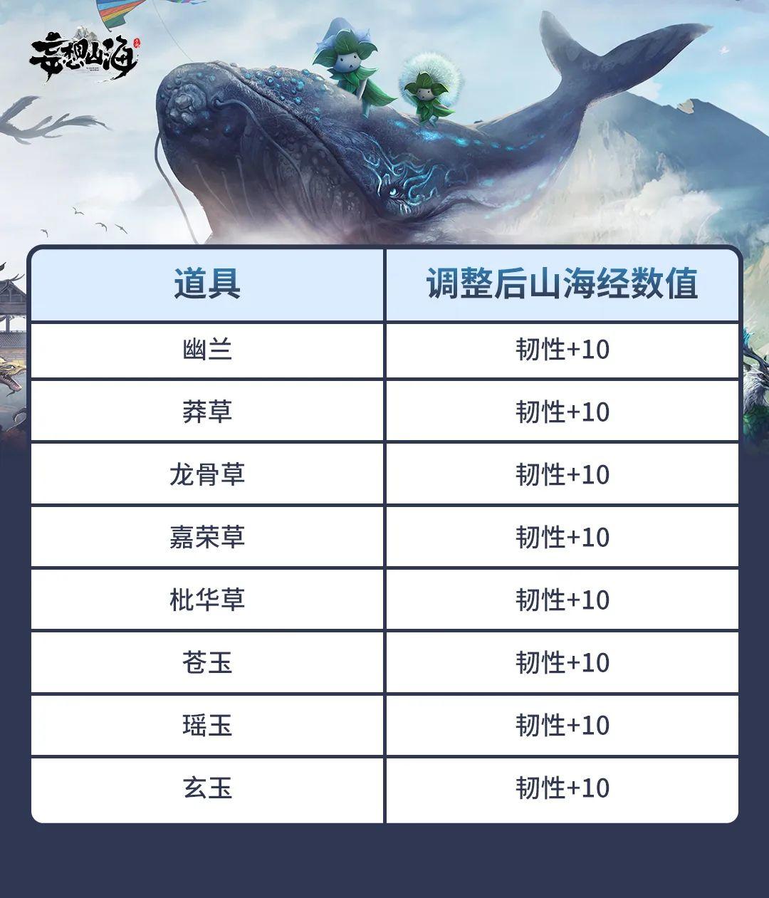 幽兰等11个道具,韧性增加值从+4变为+10,同时,山海经部分将对旅者的负重、背包也有相应的优化~