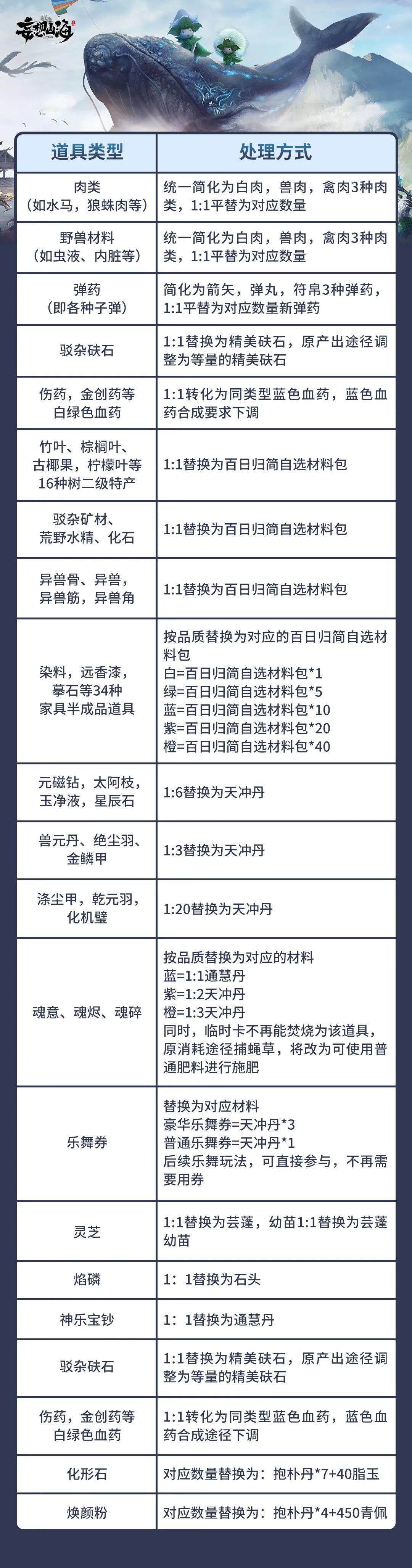 对于此类道具,将进行统一的种类精简合并,返还精简后的道具材料,并且后续不再产出,这些道具所涉及到的菜品配方、畜牧、种植、云游等玩法也会相应的进行调整。