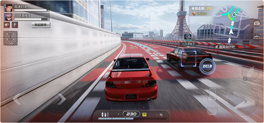 其他街头赛车手也会出现在高速公路上,遭遇可挑战目标时,系统提示将为你指引方向,点击蓝色按钮即可开启对决。