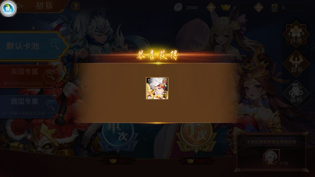 新手指导结束后,第一次来到酒馆抽卡时,先去点许愿池,有概率里面出现橙将赵云,直接无脑拿下,这是和吕布同等级别的输出猛将,可以一直保留在第一梯队。即便许愿没碰到也也不用慌,七日登录第二天就可以领到自选橙将宝箱,里面有赵云,七天还可以领到自选神将,加油哈!