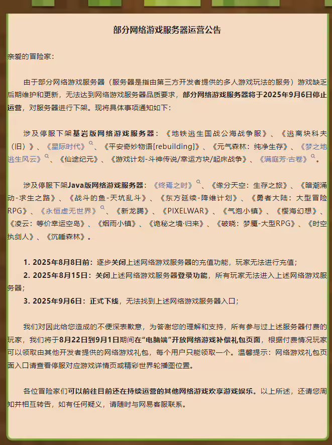 网易《我的世界》在2025年8月7日发布《部分网络游戏服务器运营公告》。