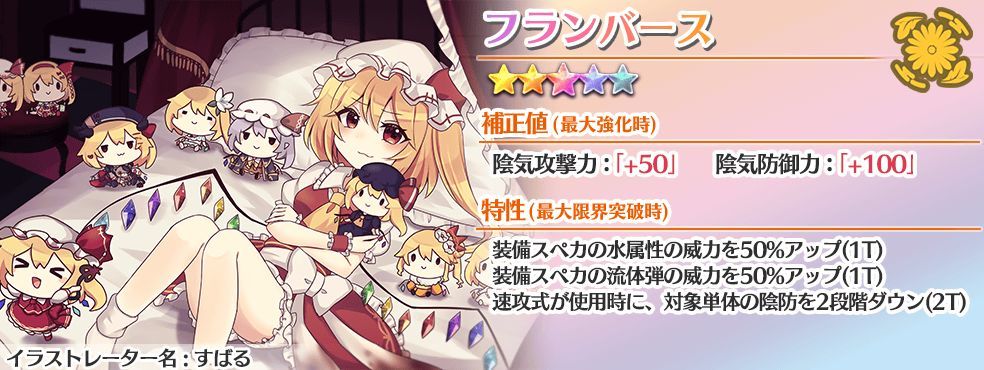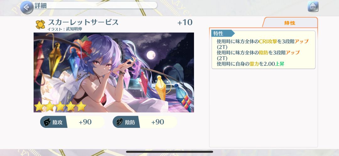 全体会心攻击阴防3段,自身2P,也是相当优质的全体拐,只不过给的阴防和自身P而不是全体P,相对于已有的限定绘卷来说竞争力也就那样。