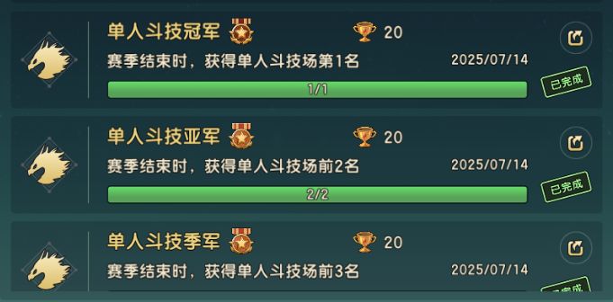 无奈斗技场的成就要求苛刻,唯有希望卡级解决,结果还出现了bug,70级组队第一后未拿到此成就,本以为没有修复,但是队友却拿到了!不仅是组队,单人第一的3个成就也拿到了。是我的角色被制裁了吗?2个赛季均未获得!