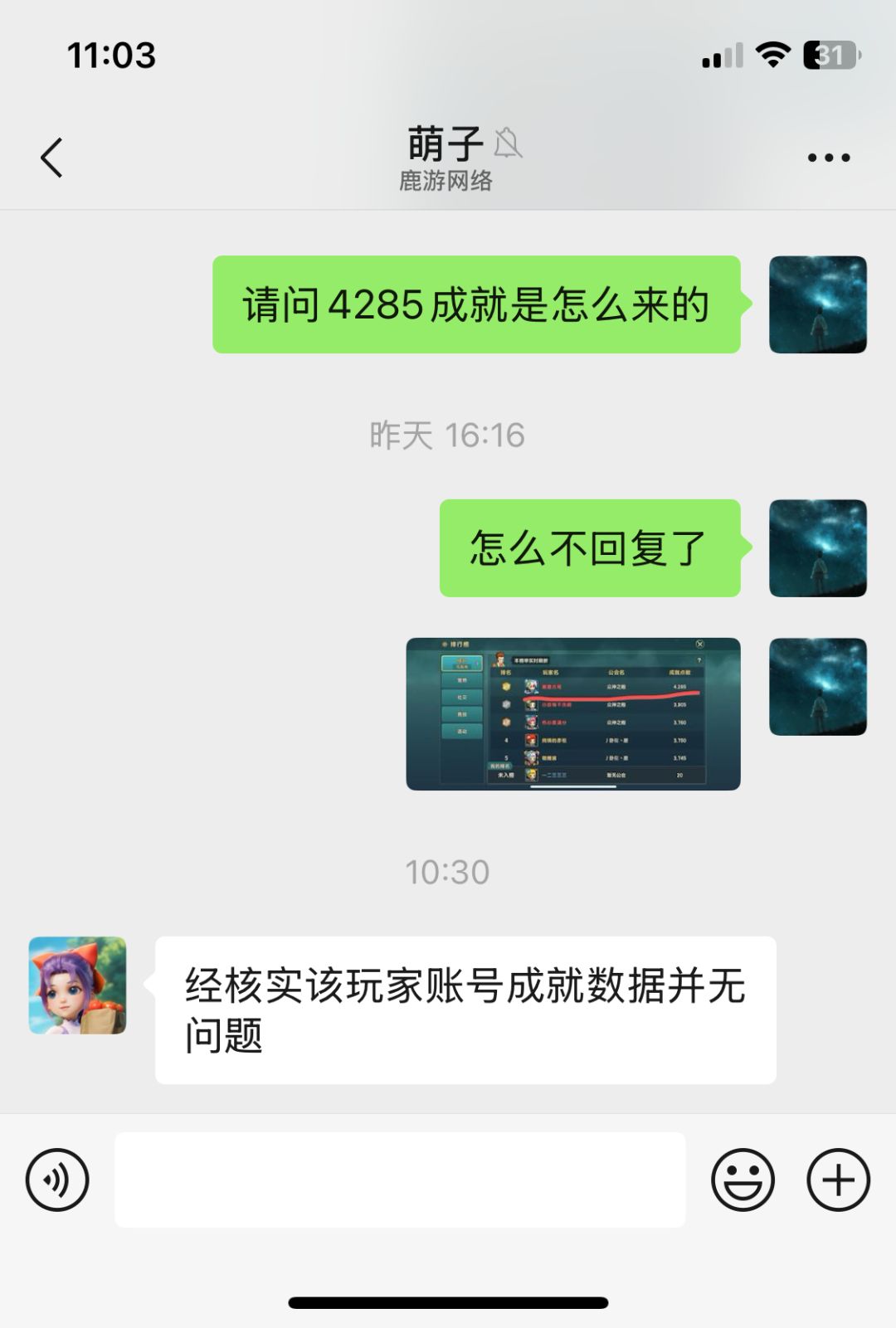 但是他们区的成就排名里就是他显示的总分4285,如此明显的错误,专属客服的回答是数据无异常!咋舌!!!