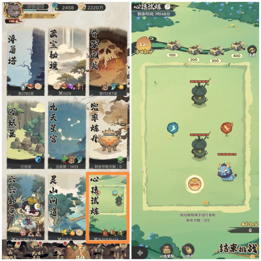 图7.道具日常白嫖获取渠道在试炼-心猿试炼里面,操作悟空头像,弹射击毙怪兽,注意利用塔和墙壁增加对怪兽的弹射次数,运气好触发来回弹射,一次即可击毙怪兽,一般需要两轮可得400分以上把奖励拿满。