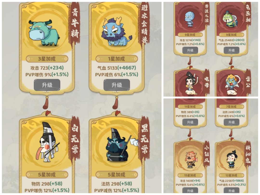 图5.可以看到图鉴附加增益,圣品激活为6%,每增加一个星级增幅为1.5%,一般灵侍技能为攻击方面的图鉴为增伤,防御+奶方面的图鉴为减伤,雷公和奔波霸是例外。