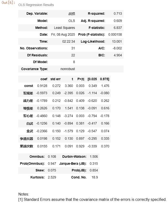 模型的调整后可决系数为0.609,说明模型具有中等的解释能力。其中军规差(P=0.026)、军心差(P=0.003)两个变量与战损存在显著负相关关系。其中,军规差的回归系数为-0.5973、军心差为-0.4860。即,如果控制其它变量不变,军规差上升一个单位,战损就会减少0.5848个单位。如只使军心差发生变化,则军心每上升一个单位都会使得战损降低0.4860个单位。值得注意的是,战力差、白武、金武数量等变量已知与战损相关,但在模型中却没有显著相关性。综合来看,当上述多个变量对战损的影响下同时存在时,武器的影响力显然降低。