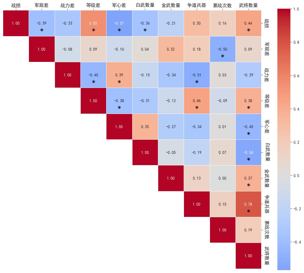 图2展示了各个变量与战损之间的相关性分析结果。可以发现军规差(ρ=-0.39)、兵种等级差(ρ=0.55)、军心差(ρ=-0.57)、白武数量(ρ=-0.36)与武将数量(ρ=0.44)对自动战斗的战损有显著相关性。其中,只有兵种等级差、武将数量的影响是正向的,其余变量的影响都是负向的。本文认为这是一种巧合,因为部分测试在班超西域中进行,而这一副本中AI开局兵种等级通常较高,因此兵种等级差的影响实际上表明AI的兵种等级高于玩家时,会大幅增加玩家的自动战斗战损。而武将数量增加会导致自动战斗战损增加,这不符合常理,我们认为这只是一种巧合,而相关性并不代表因果性。