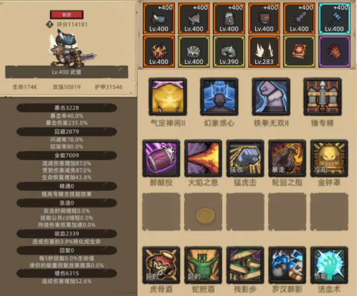 比如:酒仙的精通,尽量去堆全能和增伤的属性,圆桌就靠装备和被动堆。