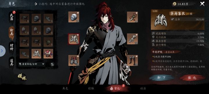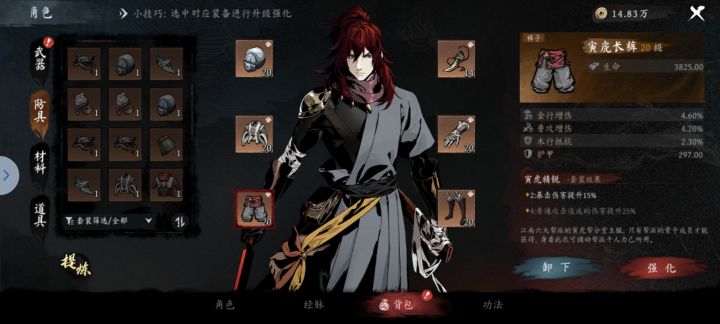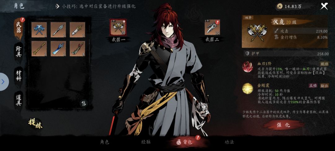 2.武器:伏虎,金刚震不怕群攻,闪避普攻也较为灵活;副武器的被动主武器也可以吃到,在流血基础上可以装备攻击力/暴击被动的副武器。