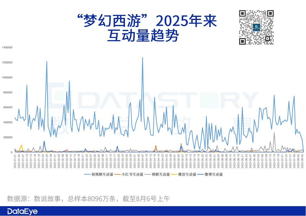 互动量方面(赞、转、评、投币、收藏等):截至8月5日,今年以来「梦幻西游」全网内容互动量达8096万次,并且多是围绕短视频平台进行互动。由此可见,《梦幻西游》在短视频平台拥有不小的受众群体。