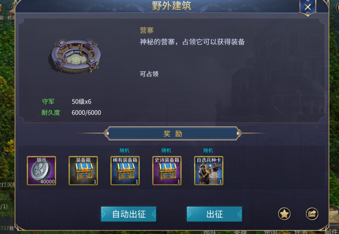 4,营寨。占领后可以获得五万银币,有概率获得高级装备,地图随机出现,周三,六七点刷新。