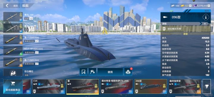 096拥有着两个1x2导弹和3x1鱼雷的优秀配置,属实是平民玩家的福音,在速度机动性方面为及格,是平民玩家购买潜艇的最优选择(没有之一)武器推荐:导弹使用三阶蓝色品质鹰击18b(注:不要购买成旁边的鹰击18了),鱼雷可用原配或更高强度的鱼雷。