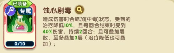 造成伤害时会施加[中毒]状态,受到的治疗降低10%,且每回合结束时受到40%伤害,持续2回合;且可叠加层数,至多叠加3层(治疗降低也可叠加) ;