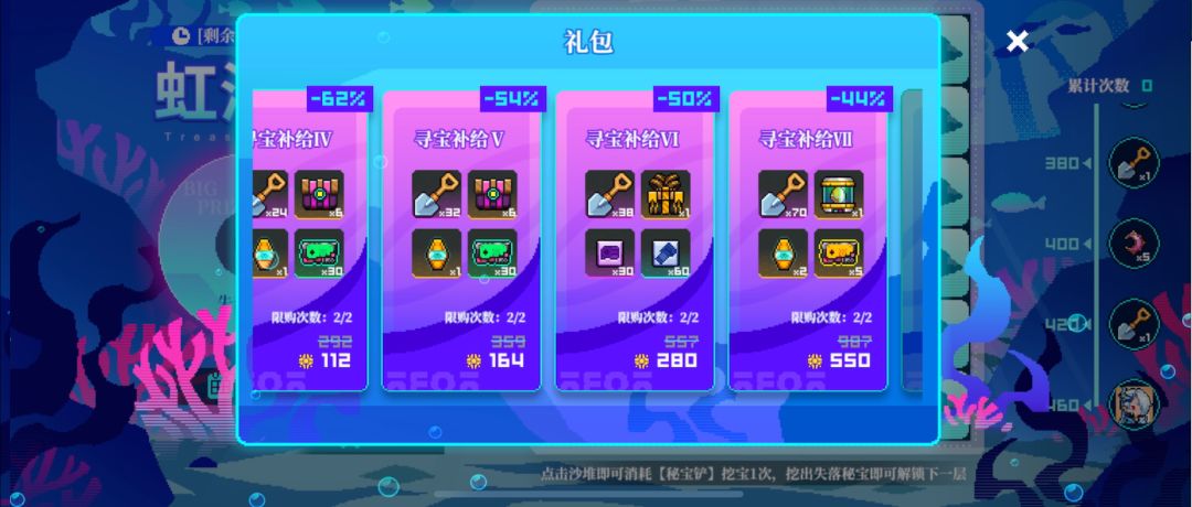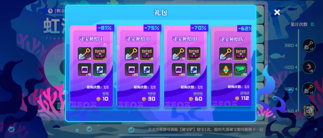 然后挖到了大秘宝就进入下一层,一层最少需要4把铲子,一般情况6-8把,运气不好就是10把左右,优先拿层数奖励。