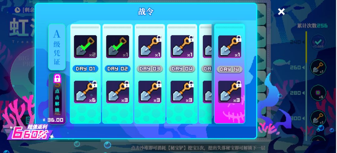 这么算下来一共白嫖14个铲子,开通36的通行证可以多获取42个,总共56个。