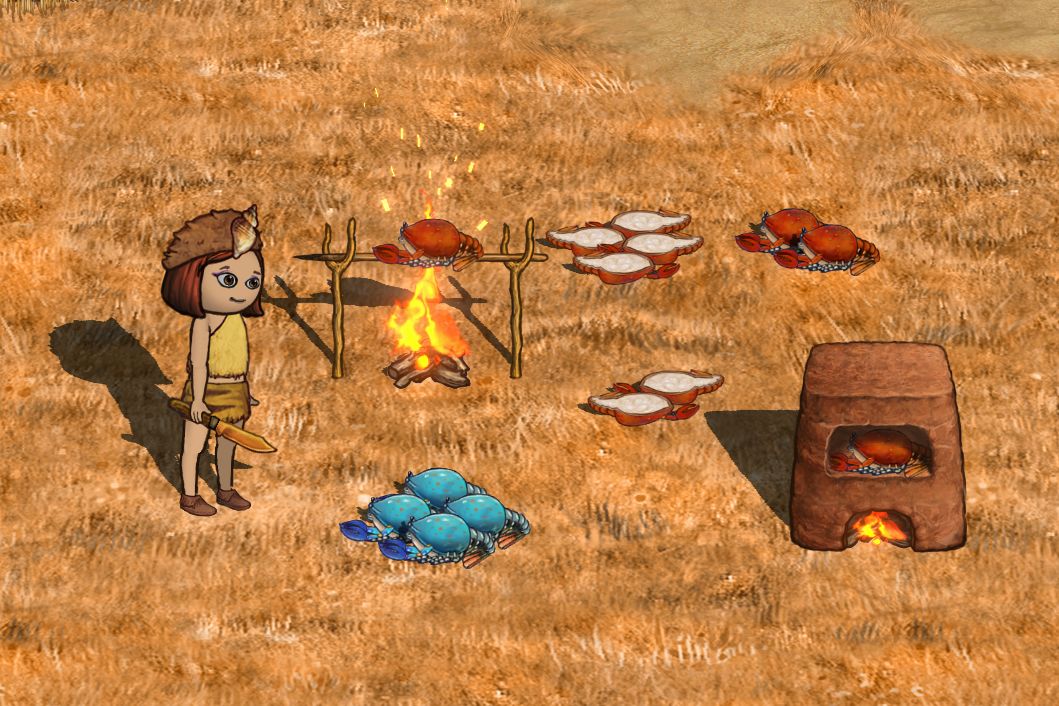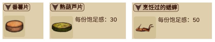 当科技进行到石器时代(一)扁石类别的时候,还可以制作增加更多饱腹感的食物:煮熟的番薯片、煮熟的葫芦片、煮熟的蟋蟀。