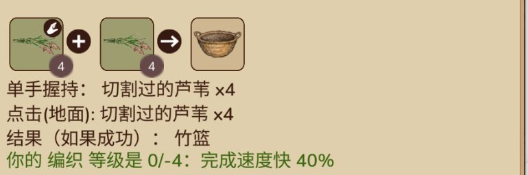 ②手持燧石刀刃在芦苇丛切割下4棵芦苇,需要两组。手持一组芦苇和放在地上的芦苇进行合成为竹篮。双手持有篮子后,点击果实就可以放入篮子里,把篮子放在地上后就可以随时取出收集到的果实进行食用。