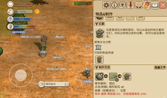 ②收集完毕后,选择你心仪的空地,把篮子里的锋利岩石拿出来堆叠在一起。最后把圆石拿在手里,与地上堆叠的锋利岩石进行交互,建成石冢。