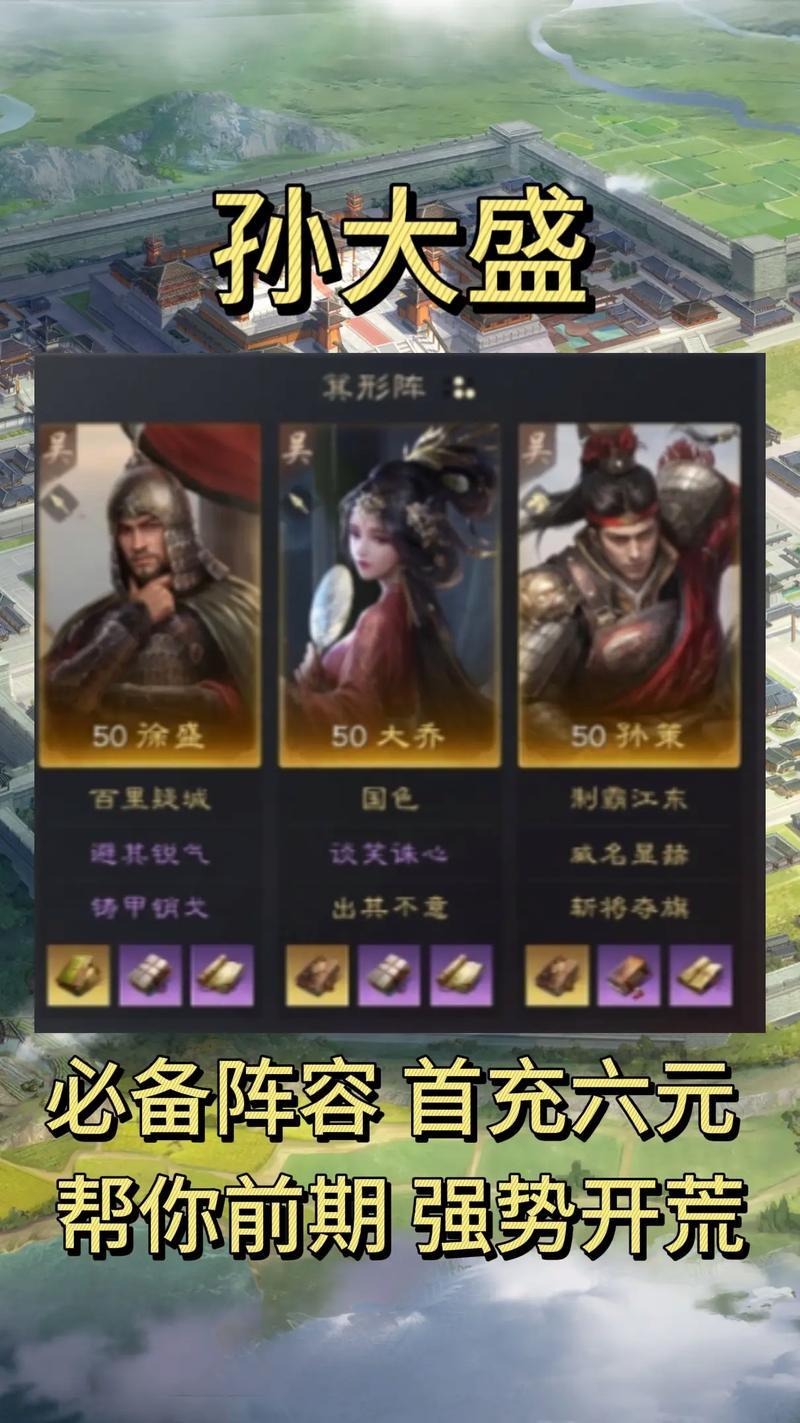 孙策作为核心输出,自带战法具备破阵和输出能力;大乔辅助控制与输出,她的技能可对敌方施加负面状态;徐盛则负责防守反击,能提供防御和反击伤害 。