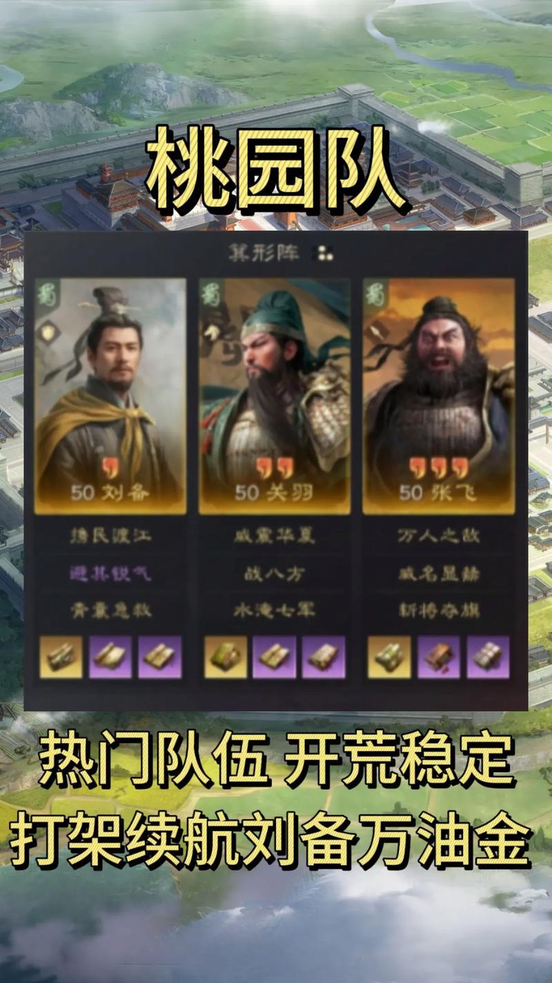 刘备作为队伍核心辅助,自带战法能提供稳定的治疗和增益效果,极大增强队伍的生存能力;张飞输出能力强劲,且具备控制技能,能对敌方施加负面状态;关羽则是强大的输出担当,拥有高额的单体和群体伤害技能 。